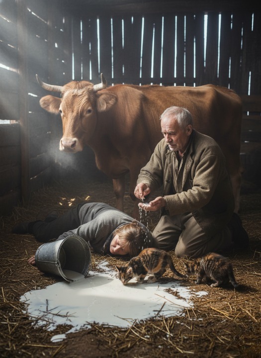 У Леонтия умерла жена. Присела доить корову, а когда вставала, в глазах потемнело, упала. Леонтий пришел в сарай, жена лежит, ведро валяется, молоко кошка с котятами хлебает.