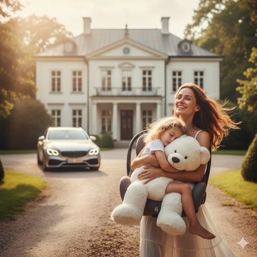 Машина подъезжает к особняку. Наталья обернулась. На заднем сидении в детском кресле сладко спит Полина. Она положила свою кудрявую головку на огромного белого медведя. Наталья улыбается.